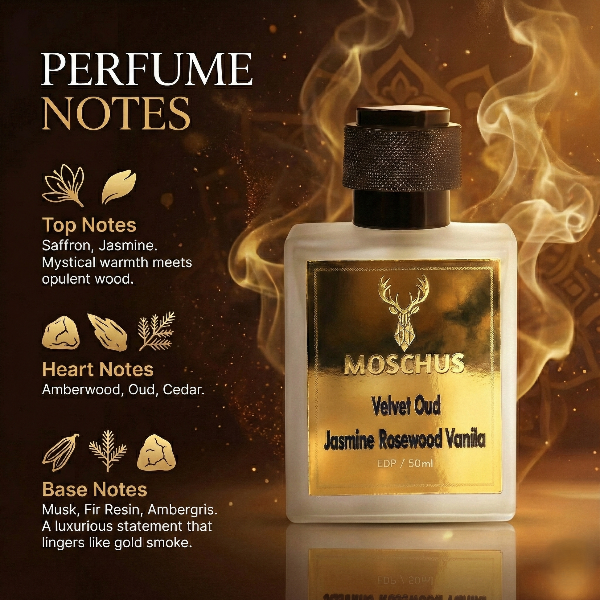 Elevate your presence with MOSCHUS Velvet Oud — where opulence meets timeless charm.